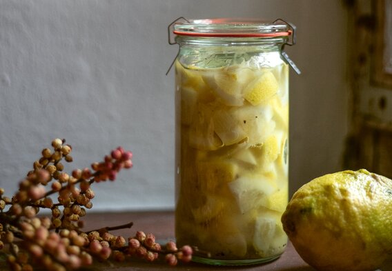 Zitronen heiß waschen, Enden abschneiden, längs aufschneiden und entkernen. Die Früchte achteln (oder nach Geschmack auch in 1 cm große Würfel schneiden) und mit Zitronensaft, Wasser, Salz und Gewürzen mischen, auf Gläser verteilen. Gut einstampfen, um Lufteinschlüsse zu vermeiden.