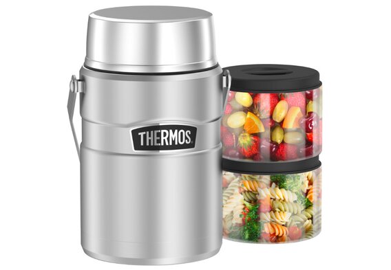 Hier werden auch zwei Personen satt. Die stapelbaren Gefäße fassen je 600 Milliliter. Die Gerichte bleiben im Behälter 12 Stunden heiß (oder 24 Stunden kalt) — garantiert die Marke Thermos. Nach Gebrauch — ab in die Spülmaschine. Im Handel erhältlich oder bei kochform.de